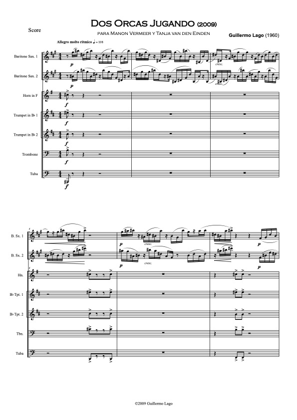 ‘Dos Orcas Jugando” was written for Manon Vermeer and Tanja van den Eijnden at the request of Manon for her Exam at the Utrechts Conservatorium. It is energetic, rhythmical and capricious with some very lyrical passages. The two baritones are the soloists in this piece, their parts are quite virtuoso. Piano reduction for brass quintet and versions for 2 bassoons or 2 bass clarinets available. (or a combination of baritone, bassoon or bass clarinet)